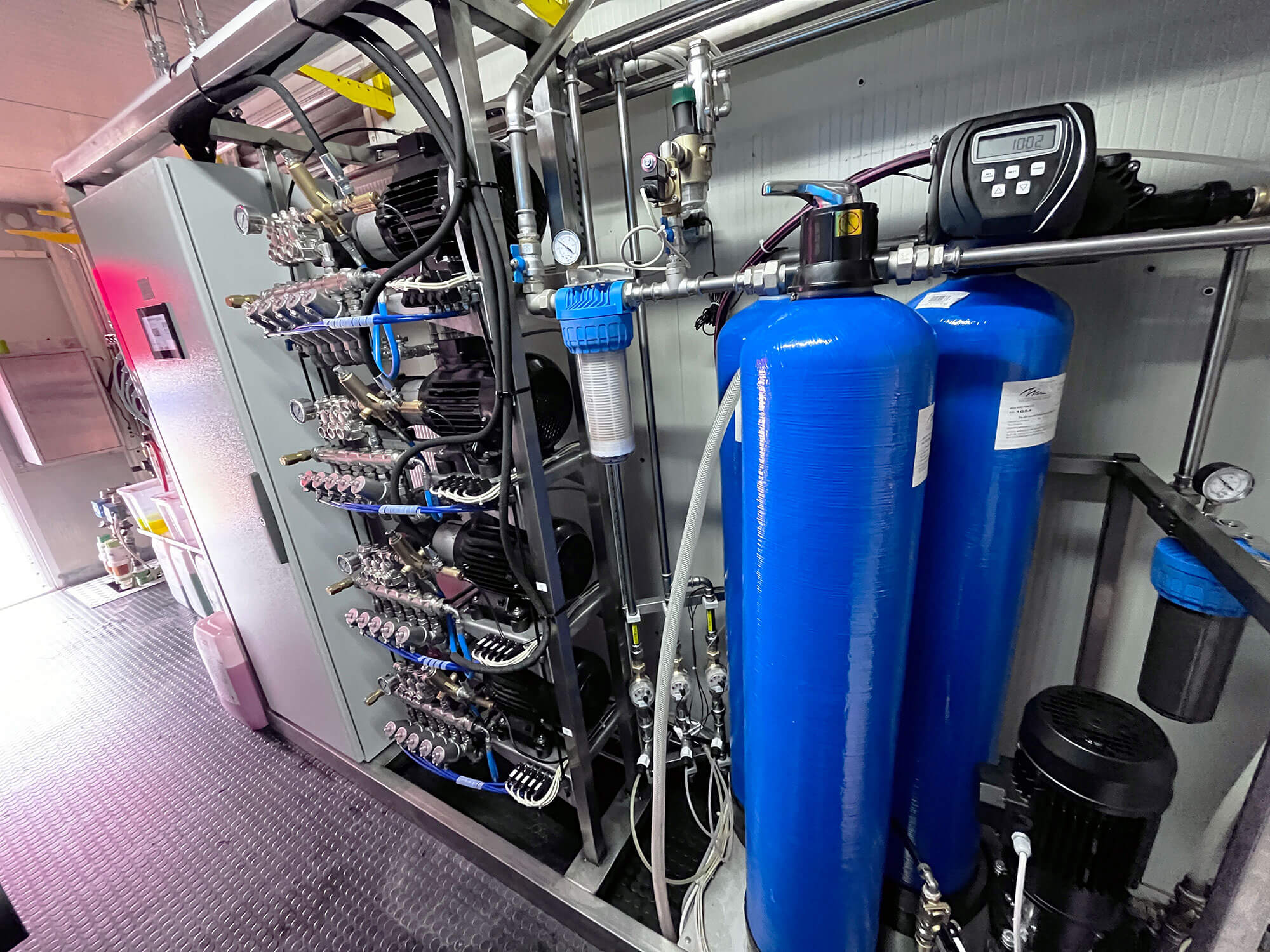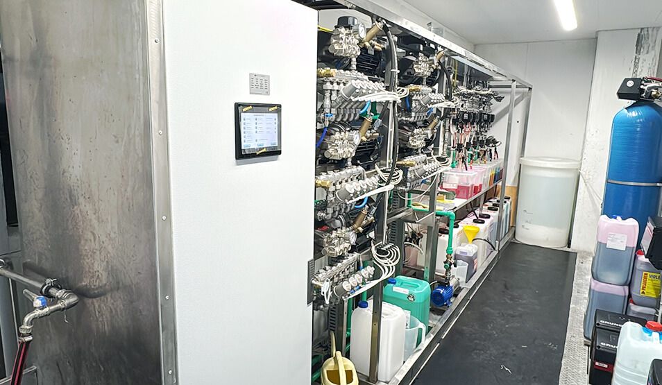 • gruppi pompa 110 bar 11 lt /min completi di collettori con elettrovalvole nichelate e valvole di regolazione completi di tubazioni di collegamento standard in R1 pistola perdente, lancia cm 70 e ugello ceramico. Il gruppo pompa alta pressione può essere maggiorato fino a 120BAR 13 lt